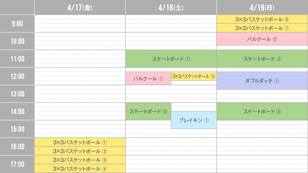 - ブレイキン、ダブルダッチ、スケートボード、パルクール、3×3バスケットボール